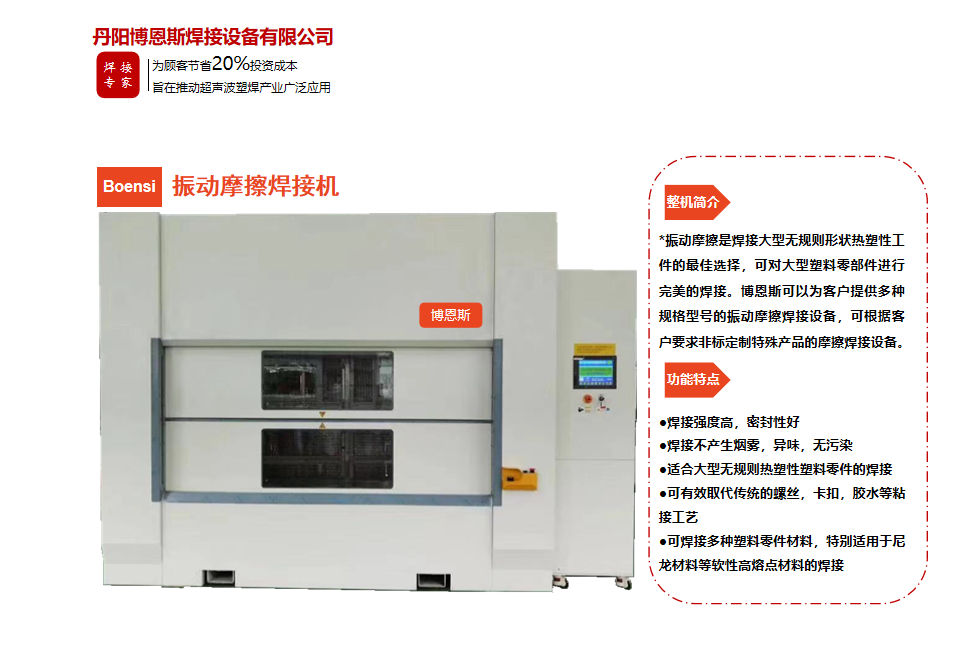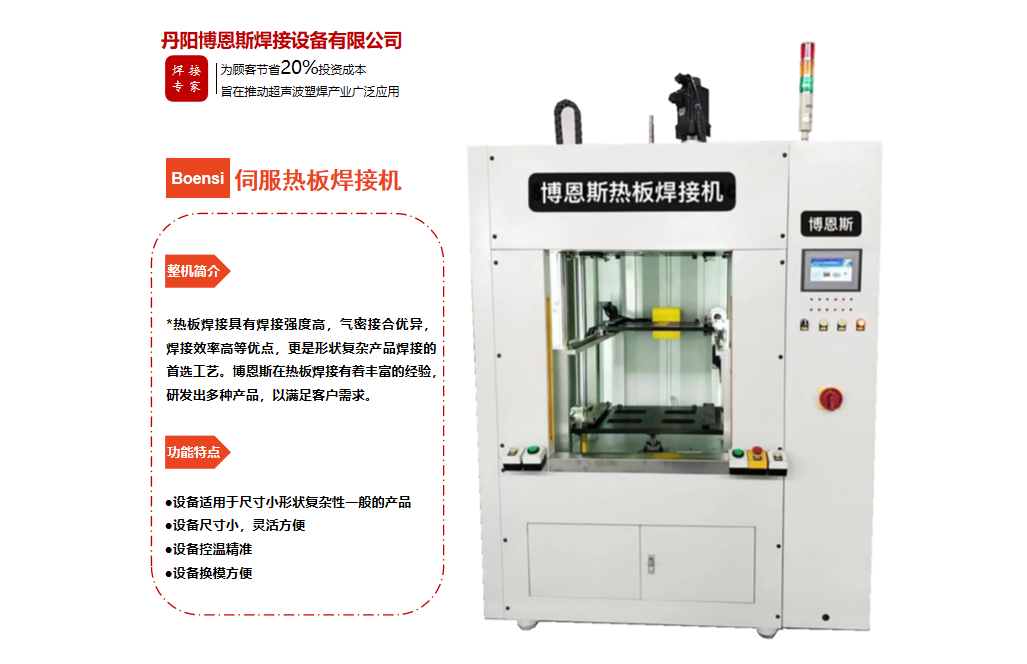 丹陽(yáng)博恩斯焊接設(shè)備有限公司是塑料焊接領(lǐng)域集研發(fā)設(shè)計(jì)、生產(chǎn)制造、銷售服務(wù)為一體的企業(yè)。公司自成立以來(lái)堅(jiān)持“以人為本”的理念,組織了一支強(qiáng)大的技術(shù)研發(fā)團(tuán)隊(duì),攜多年來(lái)積累的豐富經(jīng)驗(yàn),并結(jié)合國(guó)際先進(jìn)塑料焊接技術(shù),根據(jù)市場(chǎng)需要,不斷開(kāi)發(fā)具有核心競(jìng)爭(zhēng)力的新產(chǎn)品。公司具有很強(qiáng)的非標(biāo)機(jī)械研發(fā)、設(shè)計(jì)、生產(chǎn)能力,可為廣大客戶定制各類專用機(jī)械設(shè)備。公司設(shè)計(jì)生產(chǎn)的塑料焊接設(shè)備已廣泛應(yīng)用于汽車(chē)、電子、家電、醫(yī)療器械、無(wú)紡布...